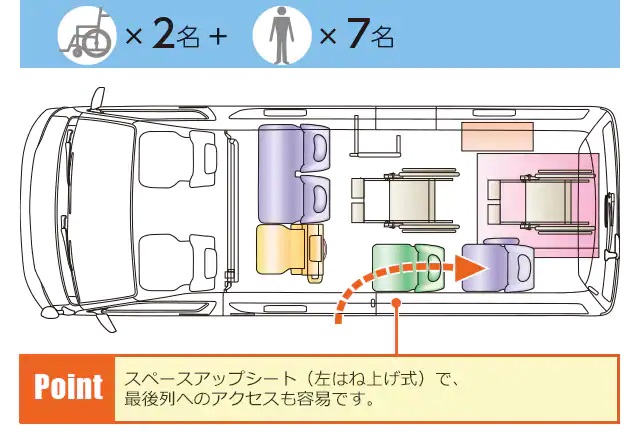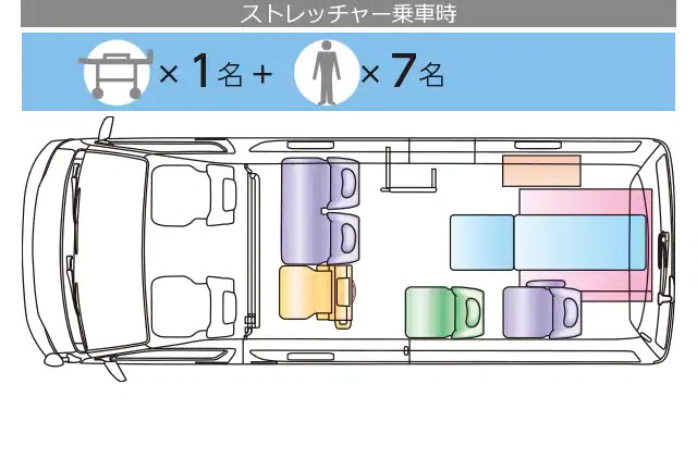 いすの方2名+歩ける方7名が同時乗車可能です。ストレッチャーも乗車可能で、ゆったりとオールマイティに使えます。
